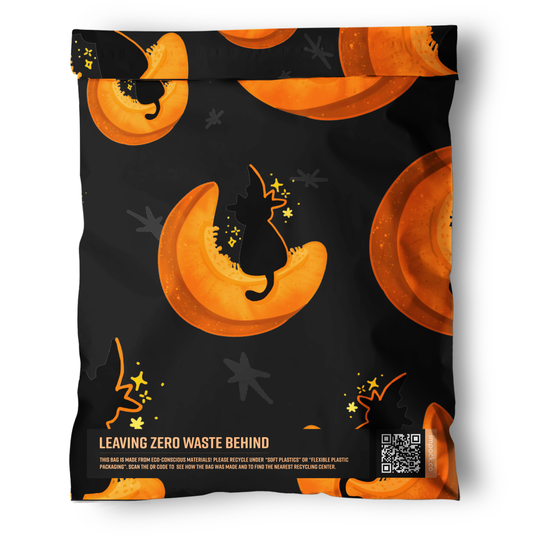 Design: The ‘Halloween Pumpkitties’ print is a playful mix of spooky and adorable, featuring bright orange pumpkin slices and charming black cats in witch hats. Accented with glowing stars and set against a bold black background, this festive design brings the magic of Halloween to life. Perfect for seasonal packaging, it’s a fun way to make your shipments stand out and leave customers smiling.