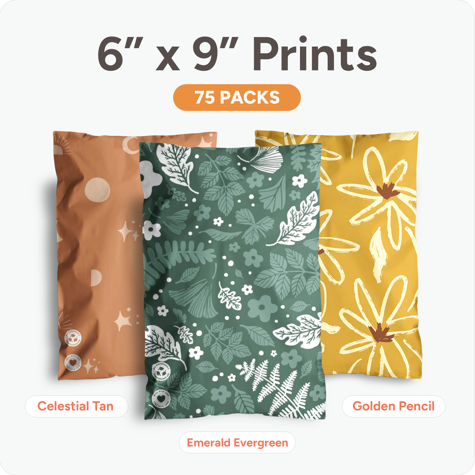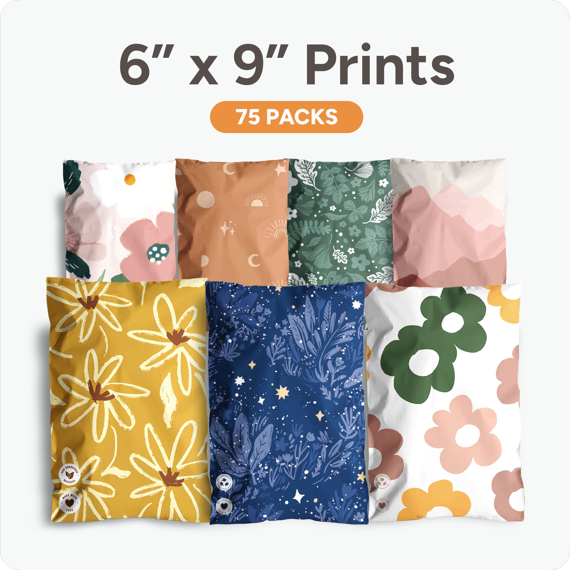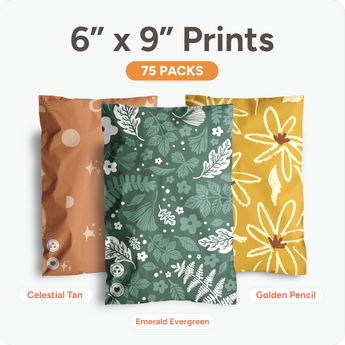 Each bundle includes three 25-pack sets of our 6" x 9" biodegradable mailers in thoughtfully paired prints. Designed to add personality to your packaging while staying eco-conscious.